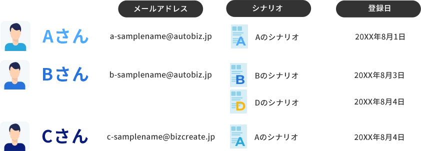 | 配信管理 | 各登録者の配信状況(次回配信日時・ステップ、エラーなど)がひと目でわかり、個別に配信の停止・再開・解除も行えます。 |